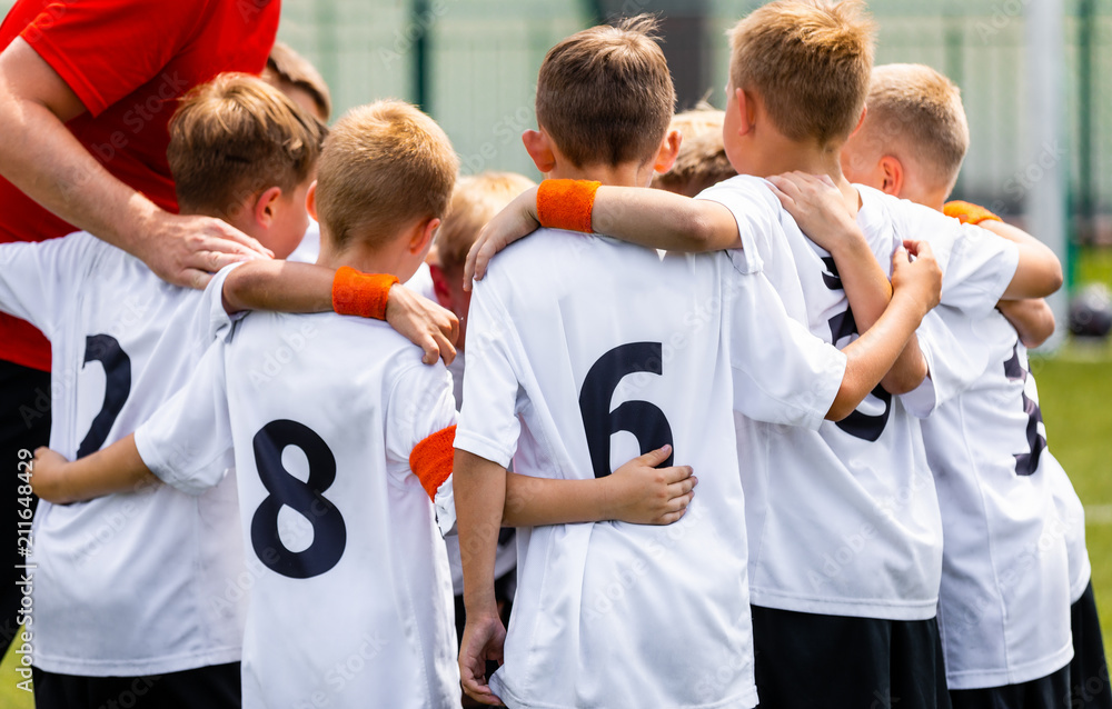 Youth sports team huddle with coach. Boys having motivational talk with coach #211648429