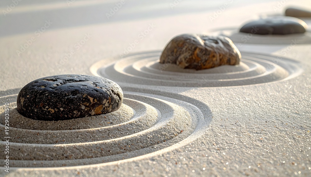 Zen Garden Harmony Stones in Sand for Meditation and Mindfulness Concept. #1929031510