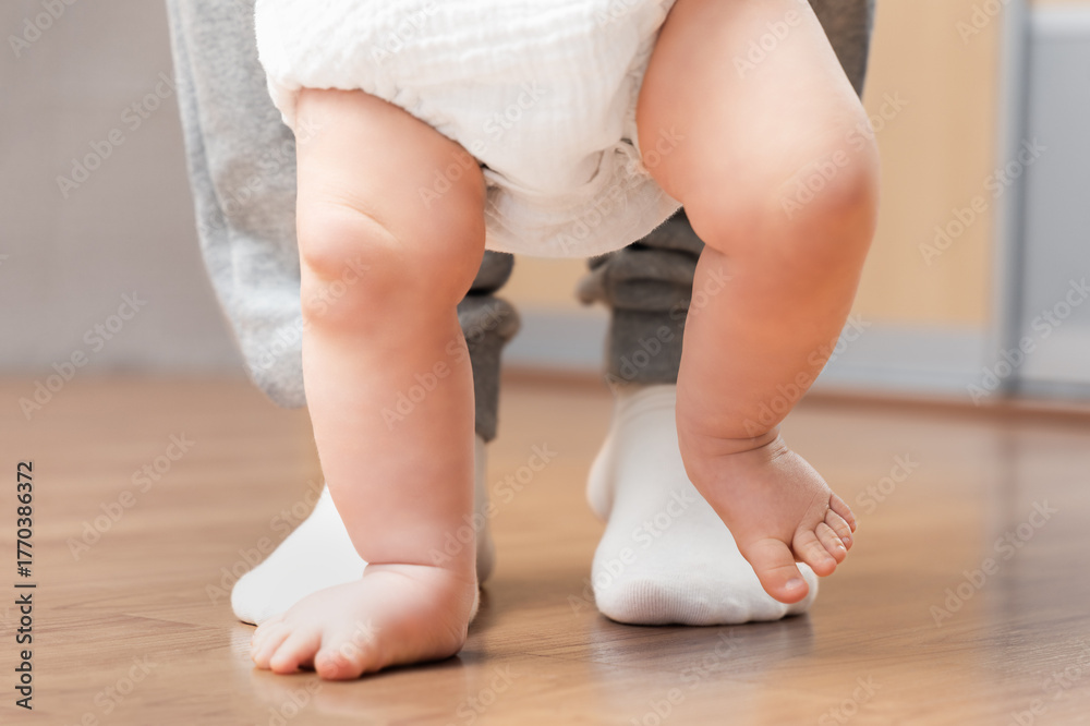 A baby learns to walk with his dad. Close-up of his legs. #1770386372