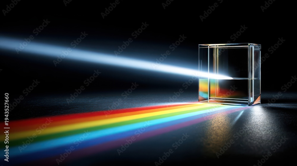 A beam of white light passing through a glass prism disperses into a vibrant spectrum of colors, showcasing the phenomenon of refraction and optical science. #1943527660