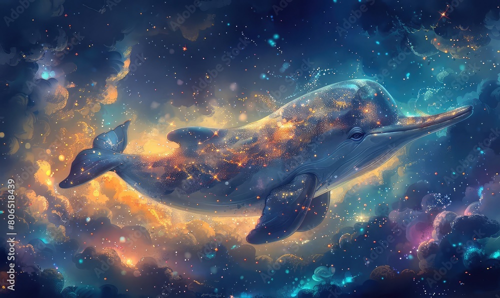 A beautiful and majestic dolphin swims through a sea of stars, its body shimmering with the light of a thousand suns #806518439