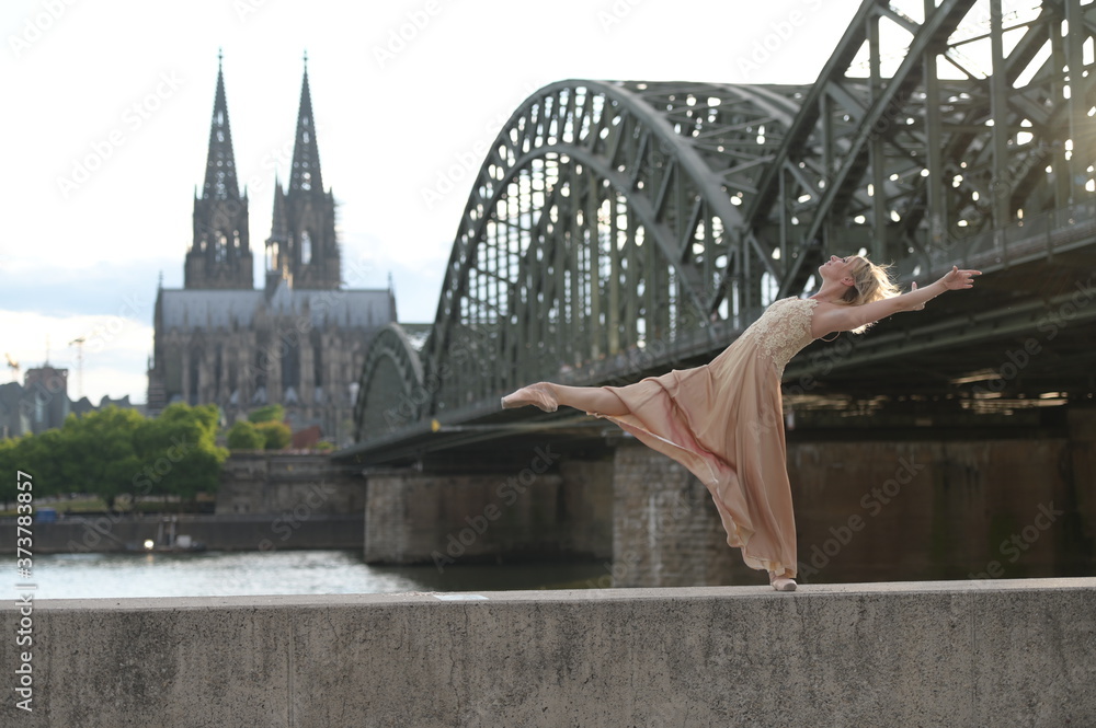 A beautiful ballet dancer ballerina outdoors ,Ballerina dancing on the bridge in Cologne City . #373783857