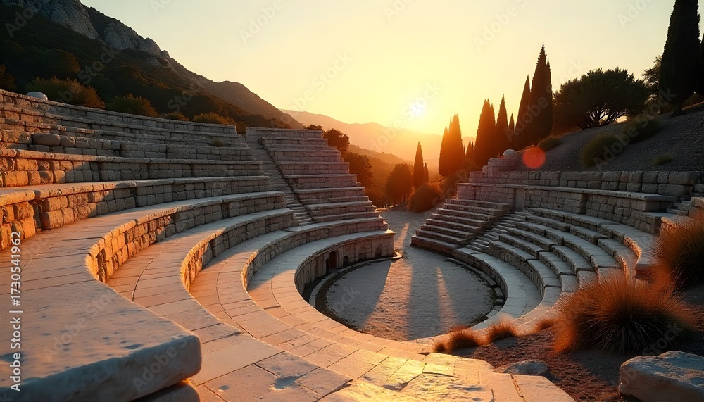 A beautiful view of an ancient amphitheater or stadium with stone seating bathed in the warm light of a golden sunset. Perfect for history, travel, and ancient civilization themes #1730541962