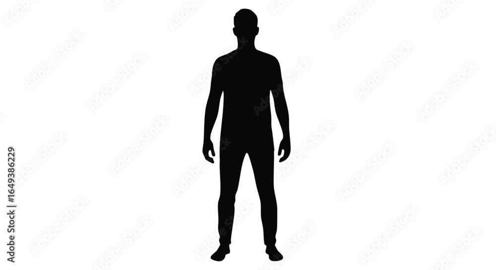 A black silhouette of a standing person isolated against a white background. #1649386229