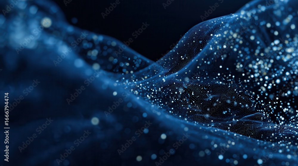 A blue banner with swirling, 3D particles representing technology. It's an abstract image that suggests scientific research, big data, and the power of technology #1666794474