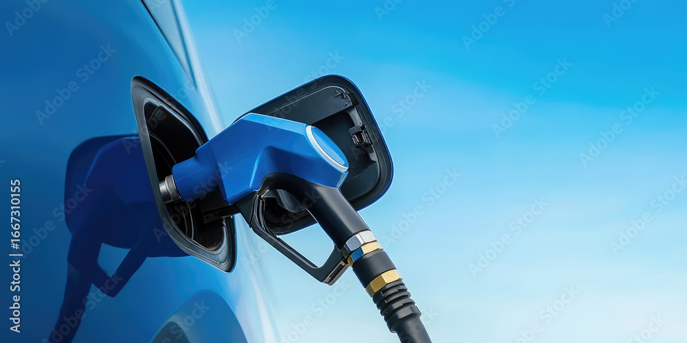 A blue fuel pump nozzle is inserted into a car's fuel tank. Refueling concept #1667310155