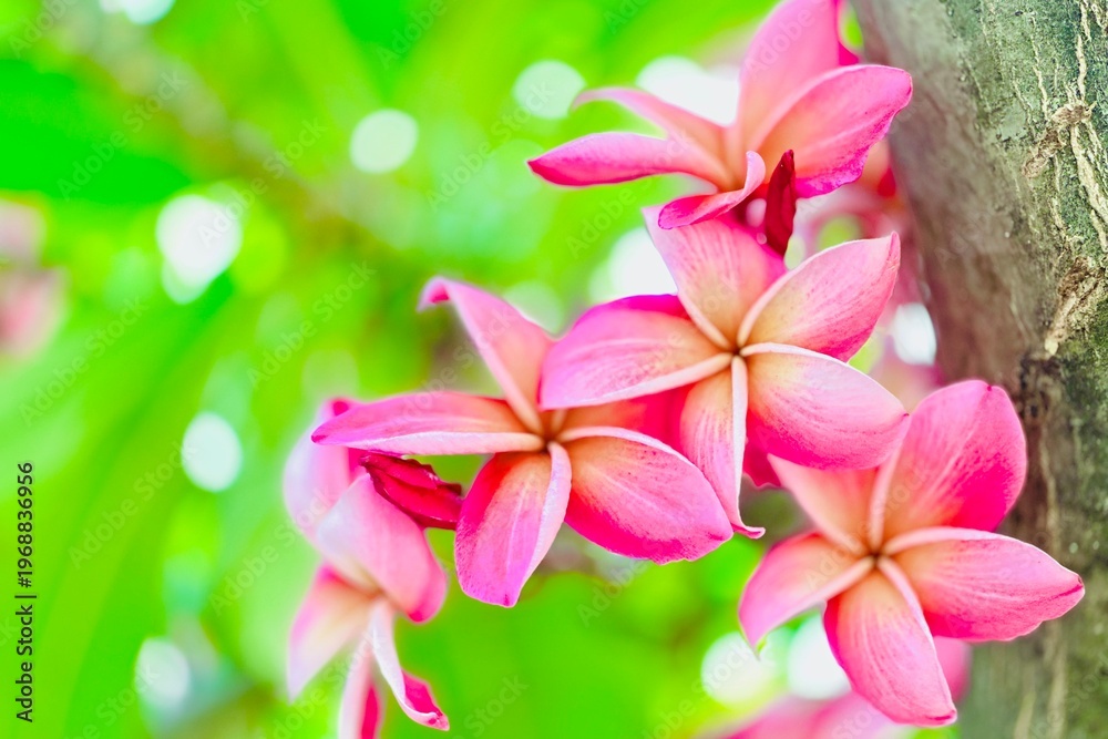 A bouquet of bright pink frangipani flowers in full bloom. The petals are a deep shade of pink with soft gradients of white and orange near the center, giving it a warm, tropical feel. #1968836956
