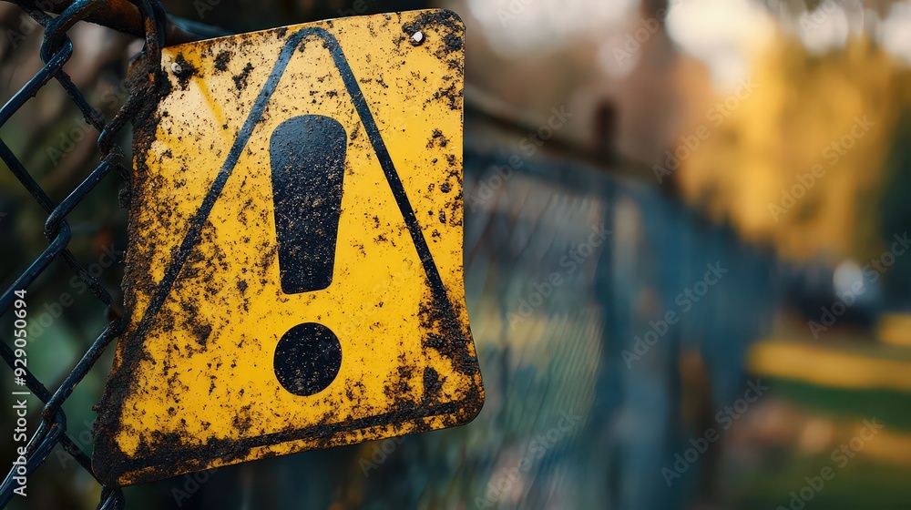 A bright yellow warning sign with a bold black exclamation mark attached to a fence, alerting people to potential hazards in the area. #929050694