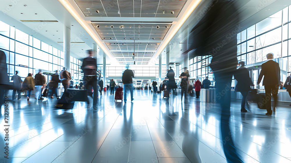 a busy airport terminal with people walking around, motion blurred photo #712794519