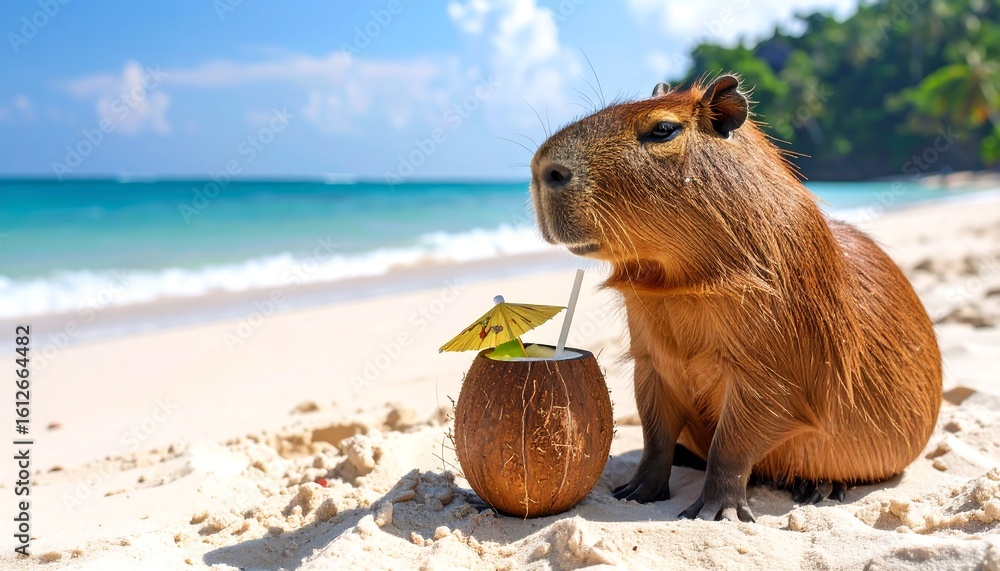 A capybara enjoys a tropical drink on a sandy beach #1612664482