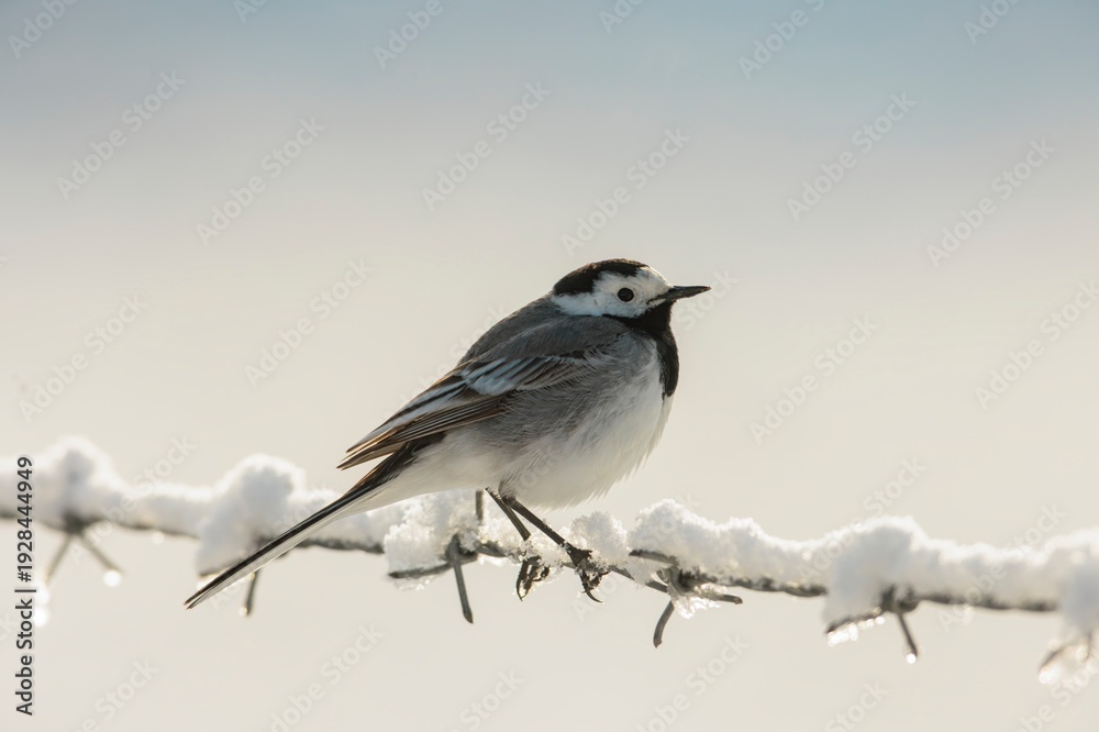 A charming bird sits on a frosty barbed wire fence surrounded by soft white snow. The stillness of dawn creates a serene winter atmosphere, inviting quiet reflection #1928444949