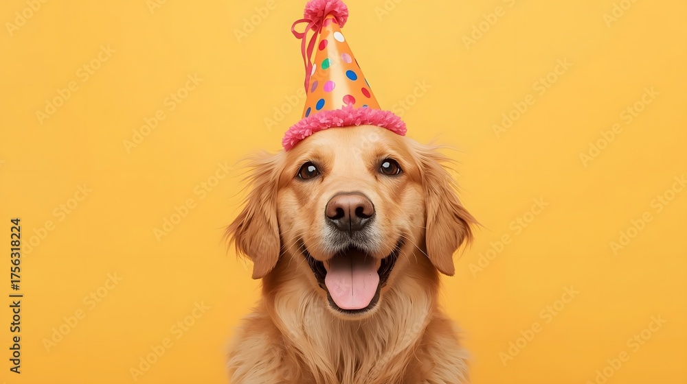 A cheerful golden retriever celebrates wearing a colorful birthday hat, radiating pure joy, it seems. #1756318224