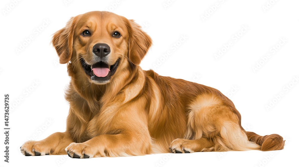 A cheerful golden retriever lying down, exuding warmth and friendliness. #1473629735