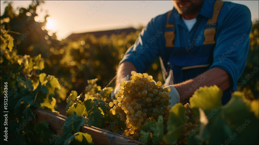 A cinematic shot of a rural vineyard during golden hour, grapes being handpicked for wine production #1512566366