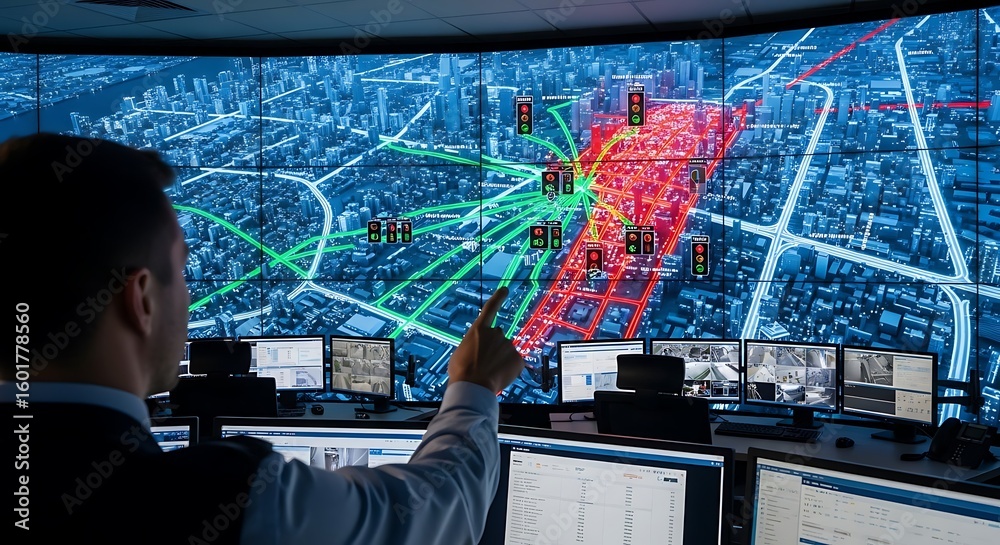 A city traffic manager monitors and interacts with a large interactive map displaying real-time traffic flow and incidents. #1601778560