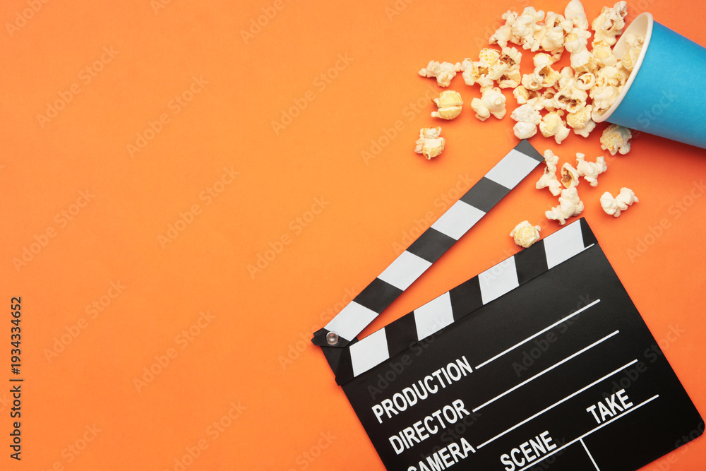 A clapper and a bucket of delicious salted popcorn on orange background. #1934334652