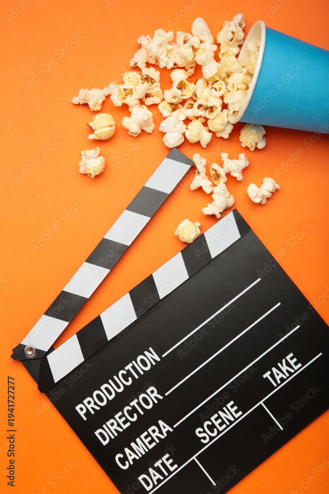 A clapper and a bucket of delicious salted popcorn on orange background. Vertical photo #1941727277