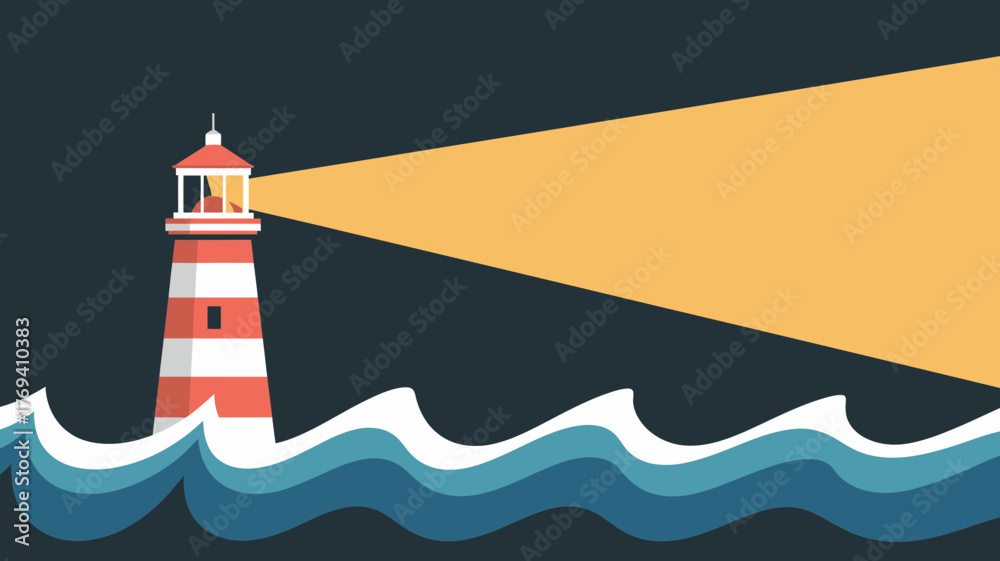 A classic red and white striped lighthouse shines its bright yellow beam across dark choppy ocean waves under a deep night sky #1769410383