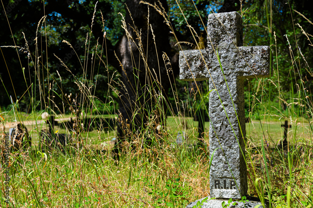 A close up image of a very old and weathered stone cross in an overrun cemetery. #1945610186