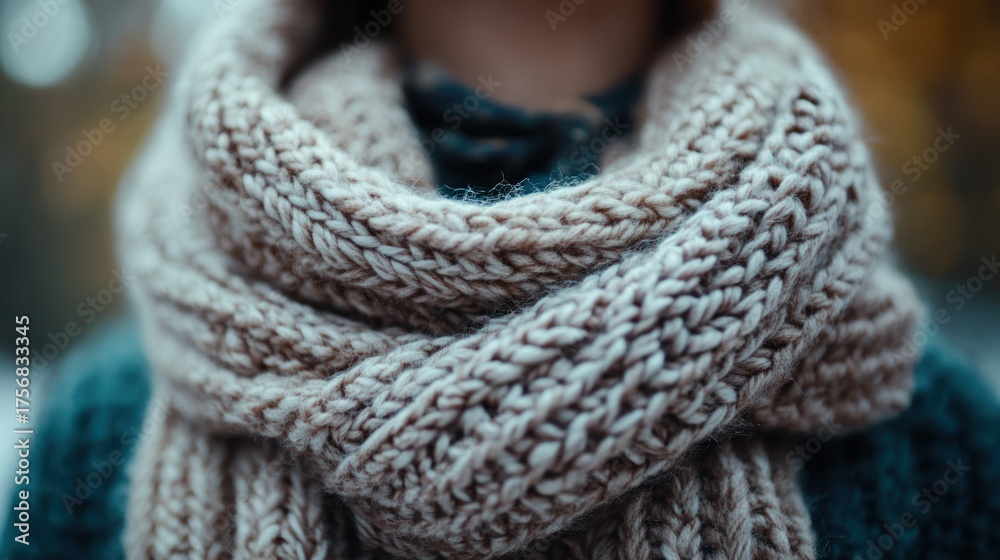 A close-up of a knitted scarf, emphasizing its texture and color. #1756833345