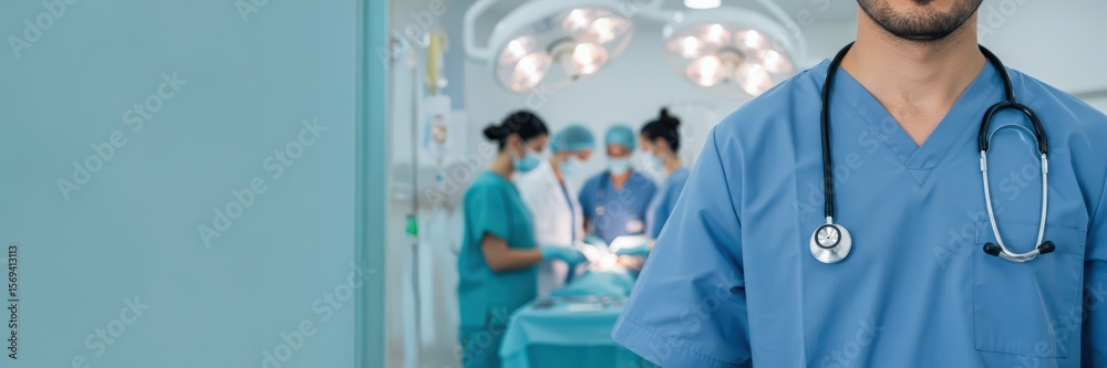 A close-up of a male doctor with a stethoscope against a medical team performing surgery in an operating room. Concept of human medical health. Banner with copy space area. #1569413113