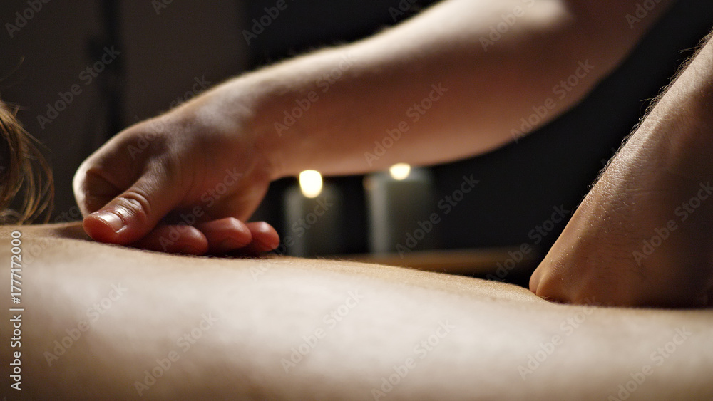 A close-up of a massage therapist's hands applying pressure to a client's back, highlighting relaxation and therapeutic touch. The serene spa environment emphasizes wellness, stress relief. #1777172000