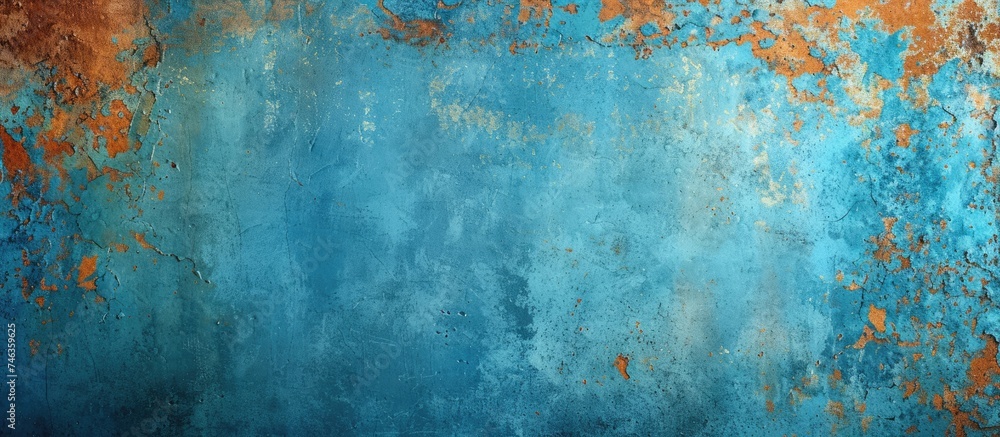 A close-up photograph showcasing a rusty metal surface with patches of blue and orange paint, creating an abstract and artistic texture. #746359625