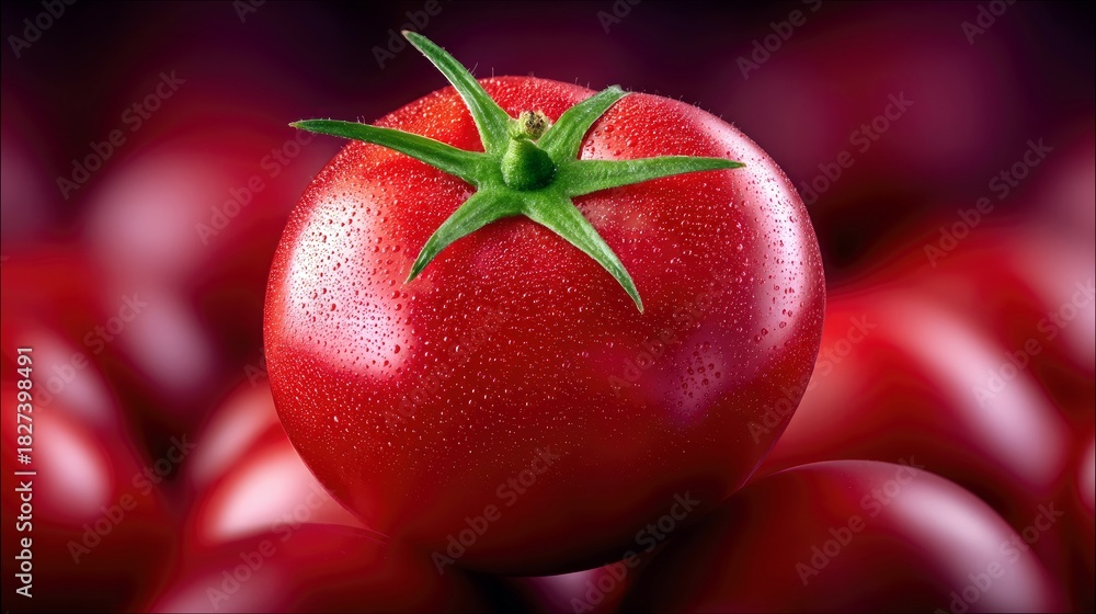 A close-up studio shot of a single, vibrant red tomato with water droplets on its surface, positioned in front of a blurred background of more tomatoes. The lig #1827398491