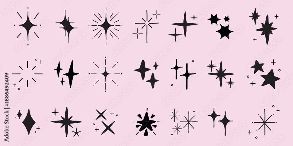 A collection of black star and sparkle icons on a pink background. Various star shapes and sparkles are arranged in rows, creating a decorative pattern. Element vector set. #1886492409