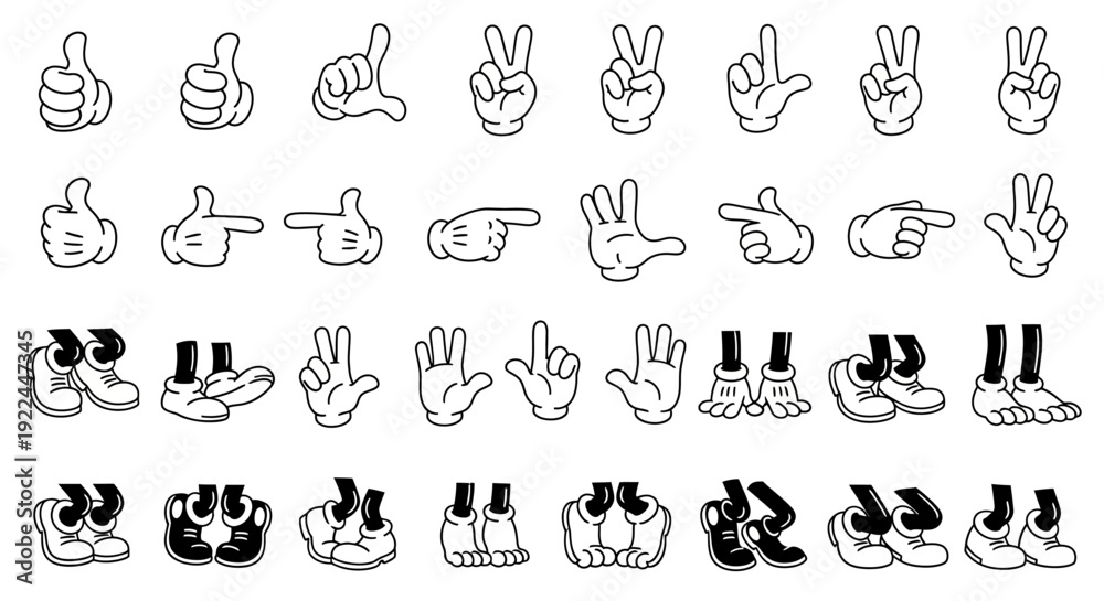A collection of cartoon hand gestures and feet poses, featuring thumbs up, pointing fingers, and various foot positions in a classic animation style. #1922447345