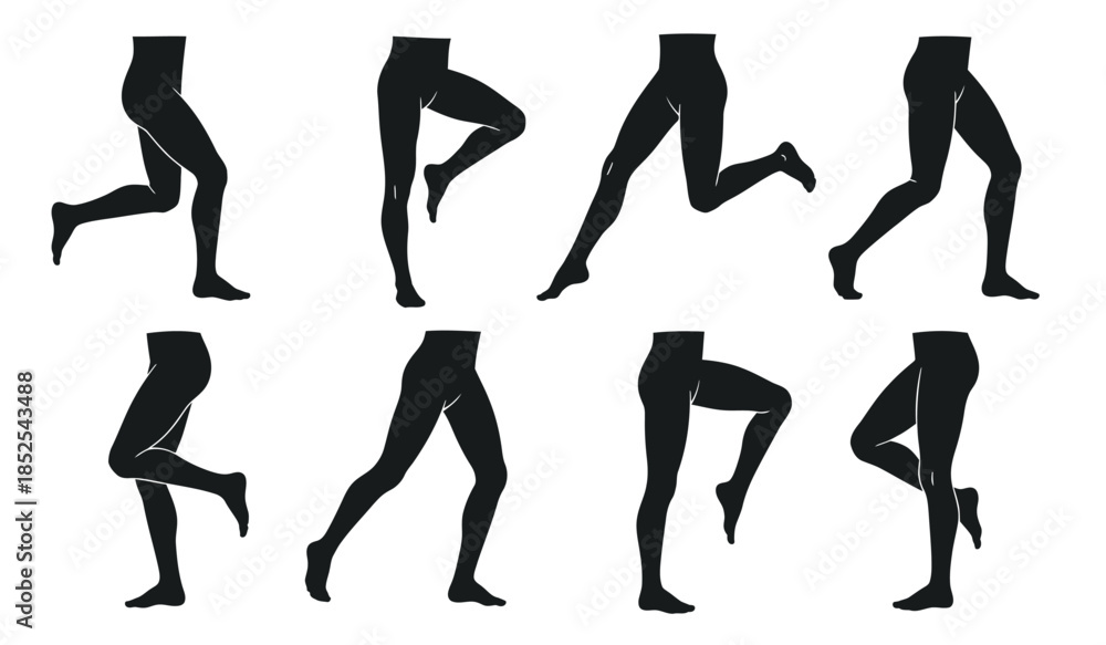 A collection of silhouettes depicting various leg and foot poses showcasing dynamic movement and anatomical studies in black and white #1852543488