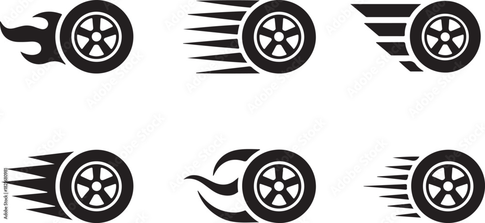 A collection of six monochrome vector icons Set of black speeding wheel icons with motion trails. Car tire, race, and velocity graphic elements vector collection. #1821680981