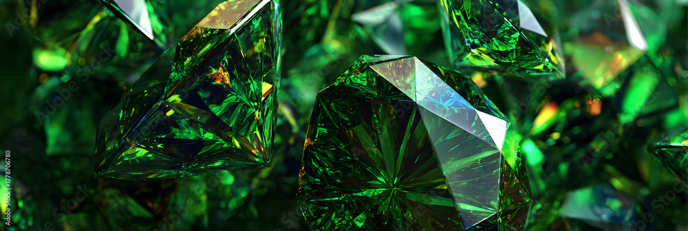 A collection of sparkling green emeralds, each precisely cut and faceted, creating a dazzling display of light and color in a luxurious arrangement #1778706780