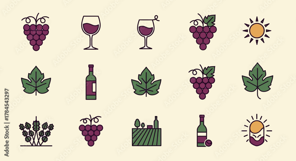 A collection of vector illustrations featuring wine-related icons. Grapes, wine glasses, bottles, leaves, vineyards and sun icons are displayed, creating a theme of viticulture and winemaking #1784543297