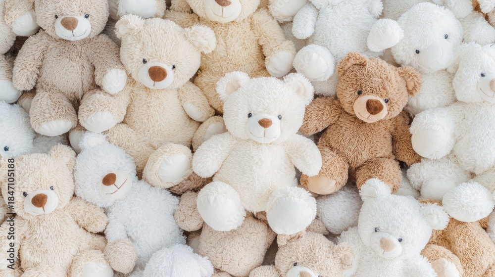 A colorful arrangement of soft teddy bears fills the space with warmth and charm, showcasing different sizes and textures #1847105188