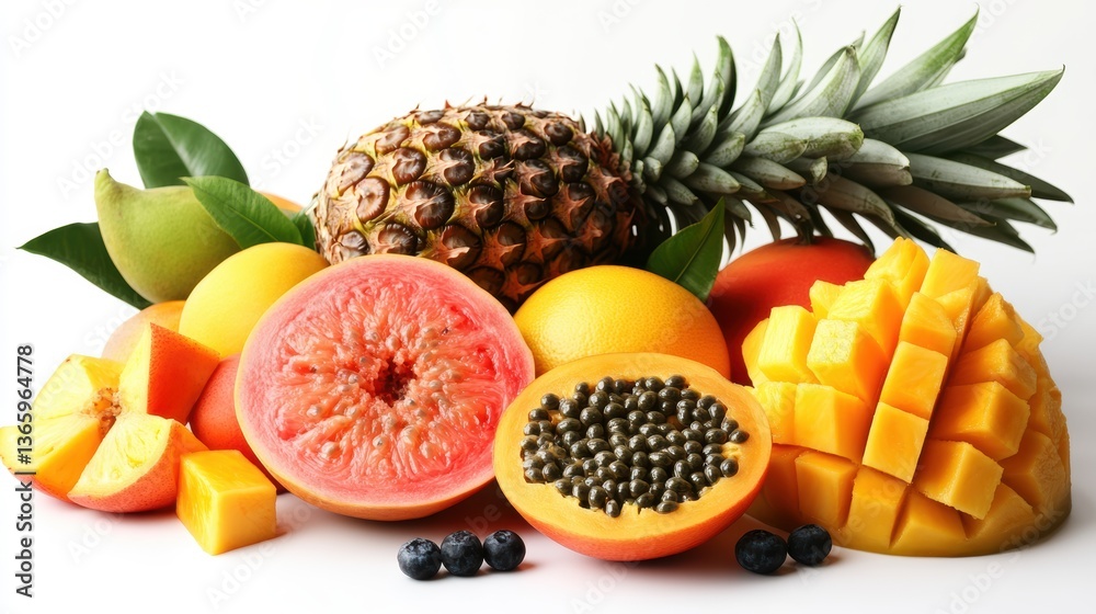 A colorful mix of tropical fruits such as papaya, pineapple, and mango, isolated on a white background #1365964778