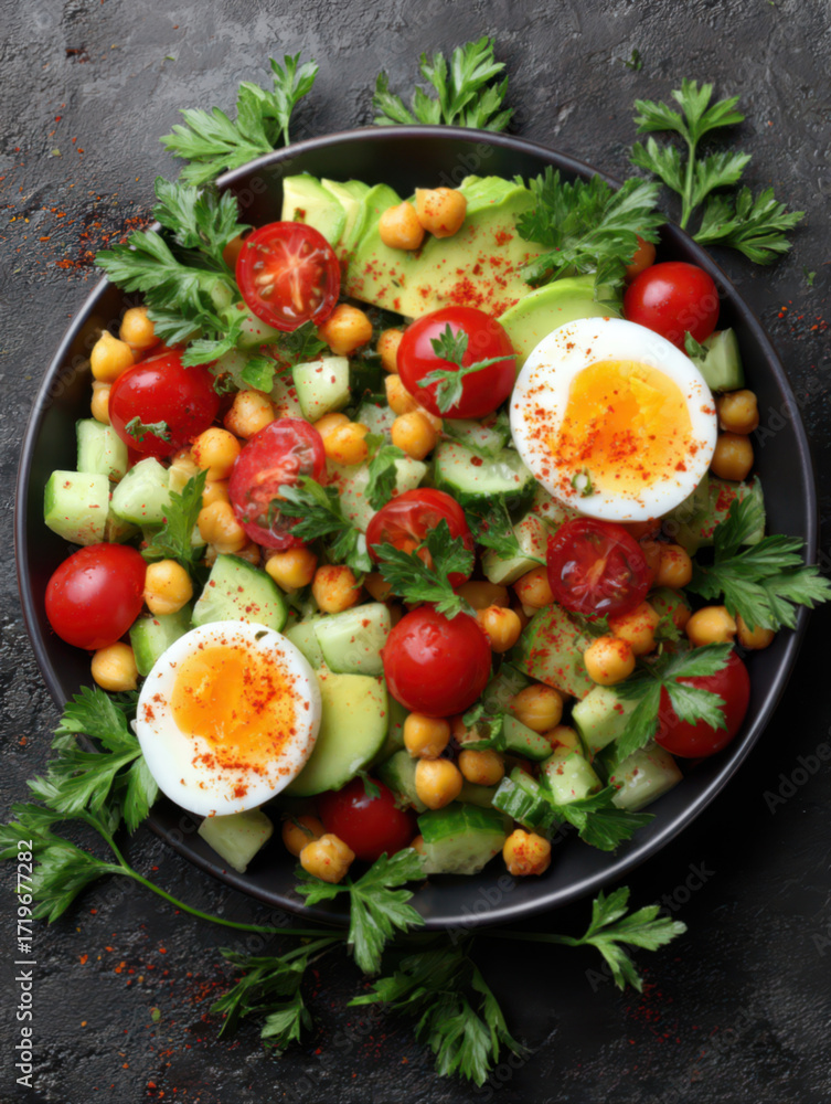 A colorful protein-packed salad bowl with halved boiled eggs sprinkled with paprika, ripe avocado slices, diced cucumber, cherry tomatoes, and chickpeas #1719677282