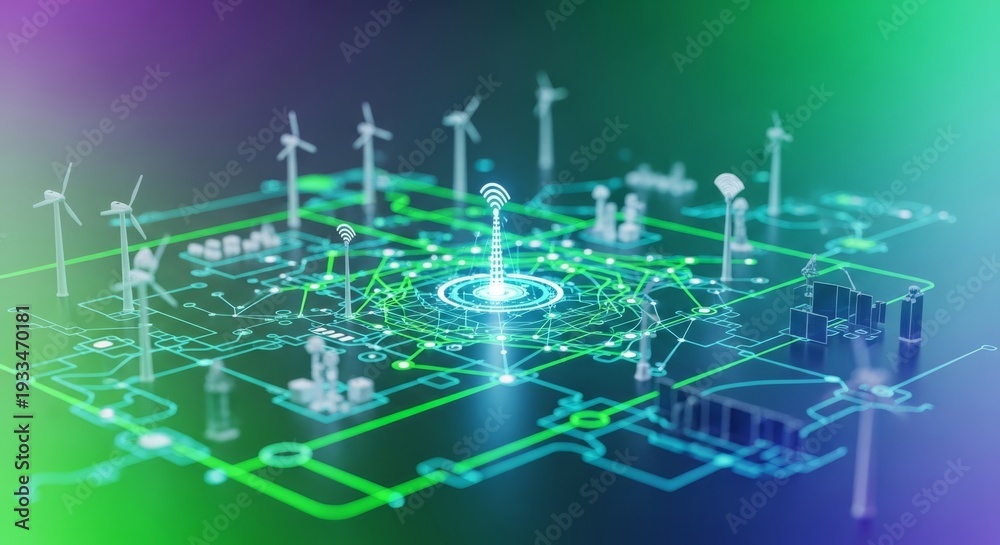 A complex digital network overlaying futuristic green energy systems, showcasing AI optimizing sustainable urban development and resource management, energy, automation, tech #1933470181