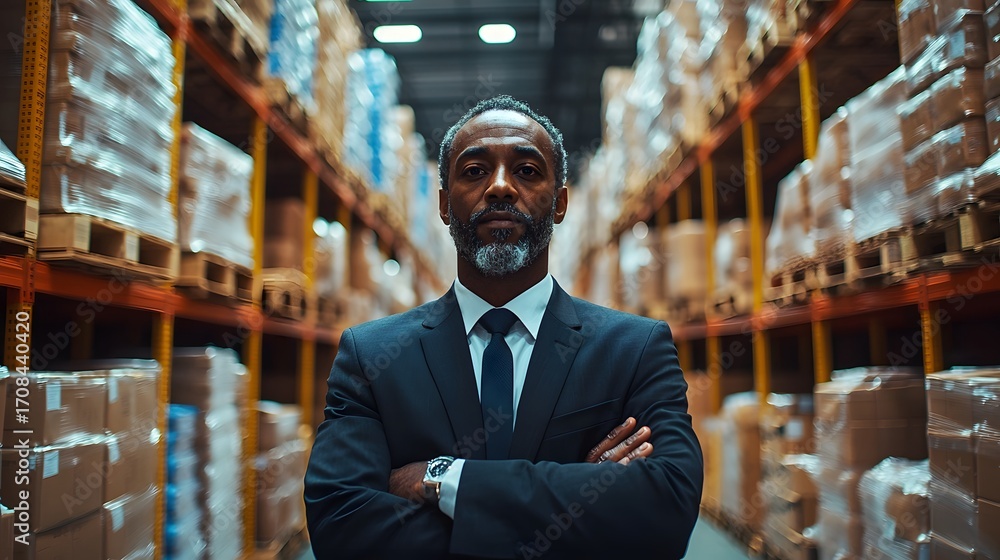 A confident businessman stands with arms crossed in a modern warehouse surrounded by shelves of goods #1708440420