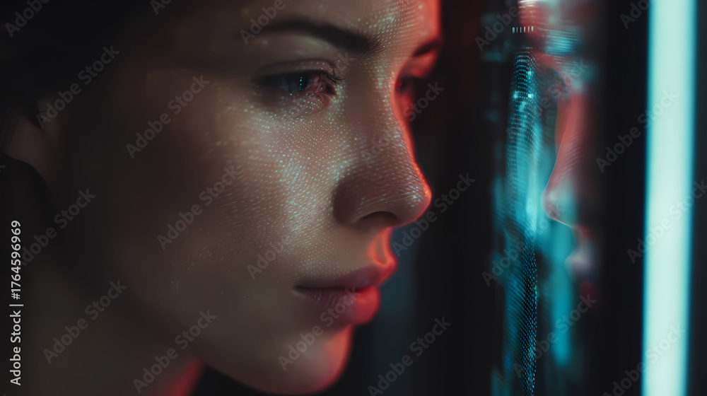 A contemplative person gazing towards the future in an ambient light setting #1764596969