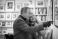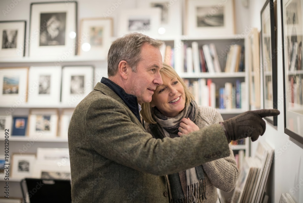 A couple is standing closely together in a gallery. They are looking at a piece of art and pointing, sharing their thoughts while dressed warmly for winter #1902129092
