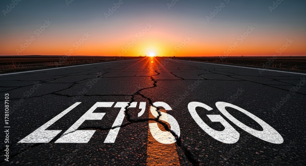 A cracked asphalt road with the words 'Let's Go' painted on it, leading towards a bright, colorful sunset. #1781087103