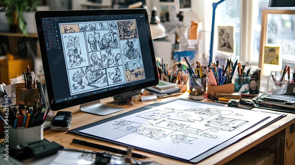 A creative workspace with a drawing tablet and storyboard sketches for an animation project #946218967