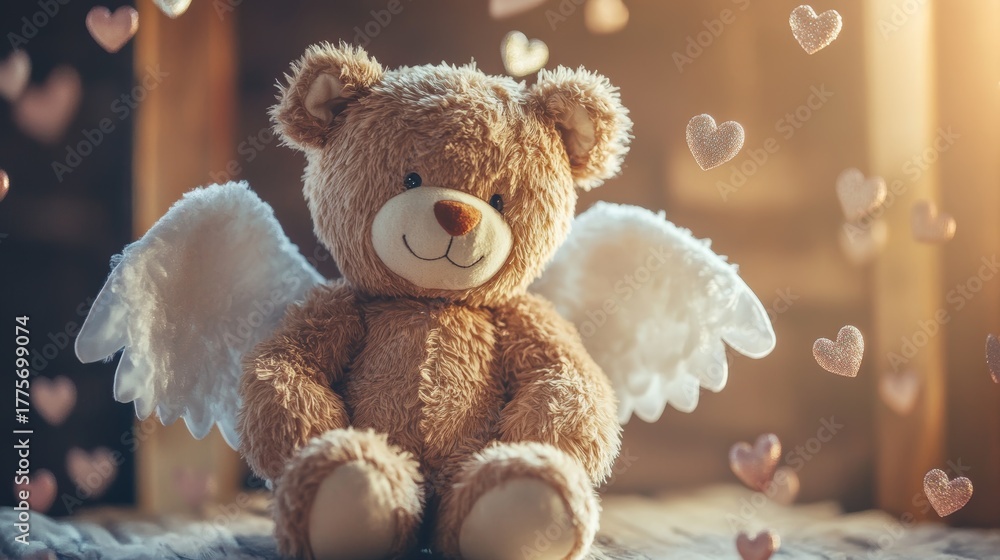 A cuddly soft toy with wings and floating love symbols isolated on a white background #1775699074