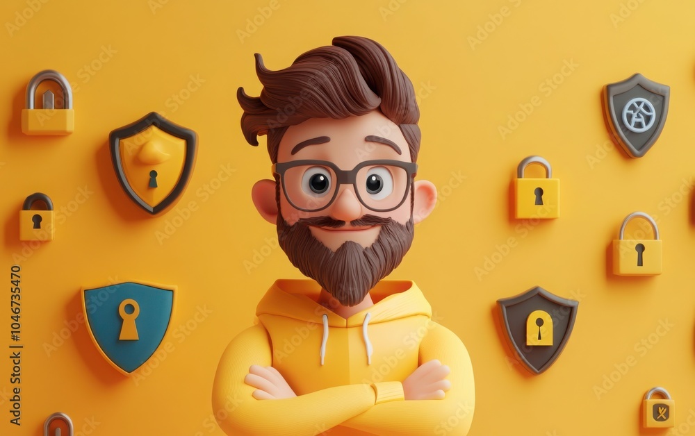 A 3D cartoon emoji of a cybersecurity specialist with a protective stance, surrounded by icons of locks, shields, and warning symbols to represent threat prevention #1046735470