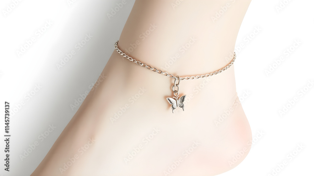 A dainty anklet with a dangling butterfly charm, isolated on white #1145739137
