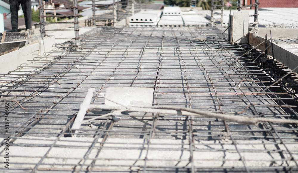 A deformed steel bars frame inside concrete footing or floor. #515794602