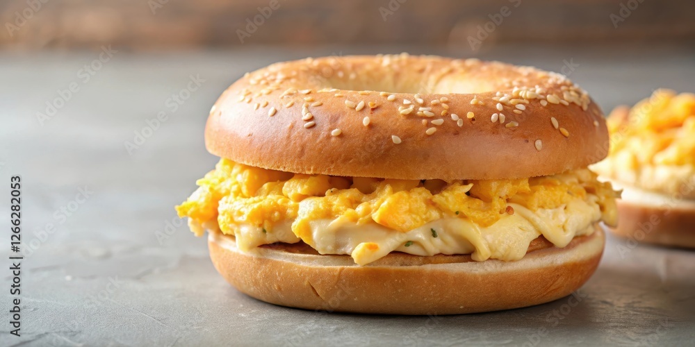 A delectable sesame bagel sandwich featuring a generous portion of creamy, cheesy scrambled eggs. #1266282053