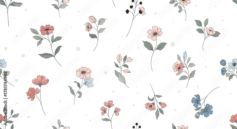 A delightful seamless pattern featuring delicate hand-drawn flowers and tiny dots in soft pastel hues, perfect for various design projects. #1781744948