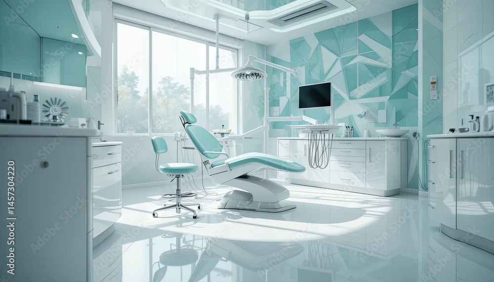 A dental clinic showcases contemporary design with mint-colored walls and ample natural light. The well-equipped space includes a dental chair, monitor, and tools, creating a welcoming environment #1457304220